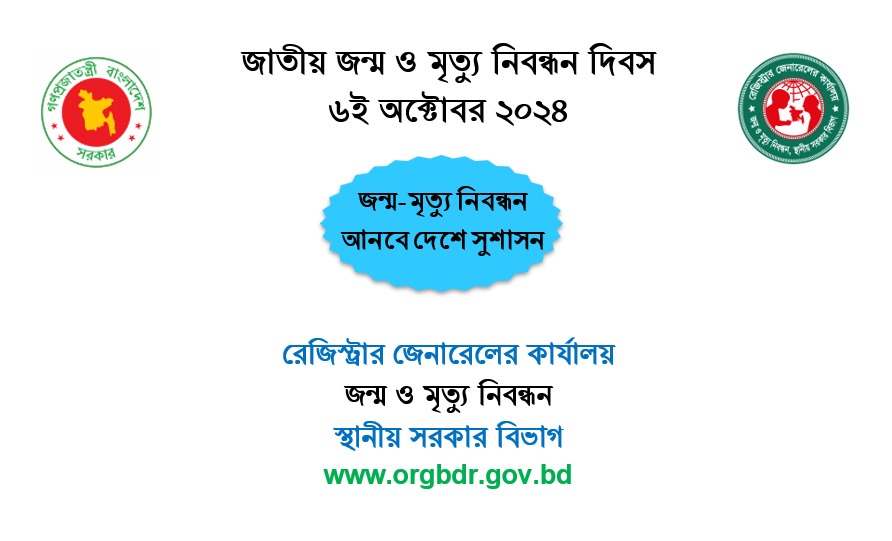 আগামী ০৬ অক্টোবর ২০২৪, ২১ আশ্বিন ১৪৩১ রবিবার জনস্বাস্থ্য প্রকৌশল অধিদপ্তরের অডিটোরিয়াম, কাকরাইল, ঢাকায় জাতীয় জন্ম ও মৃত্যু নিবন্ধন দিবস ২০২৪ উদযাপন উপলক্ষ্যে এক আলোচনা সভার আয়োজন করা হয়েছে।